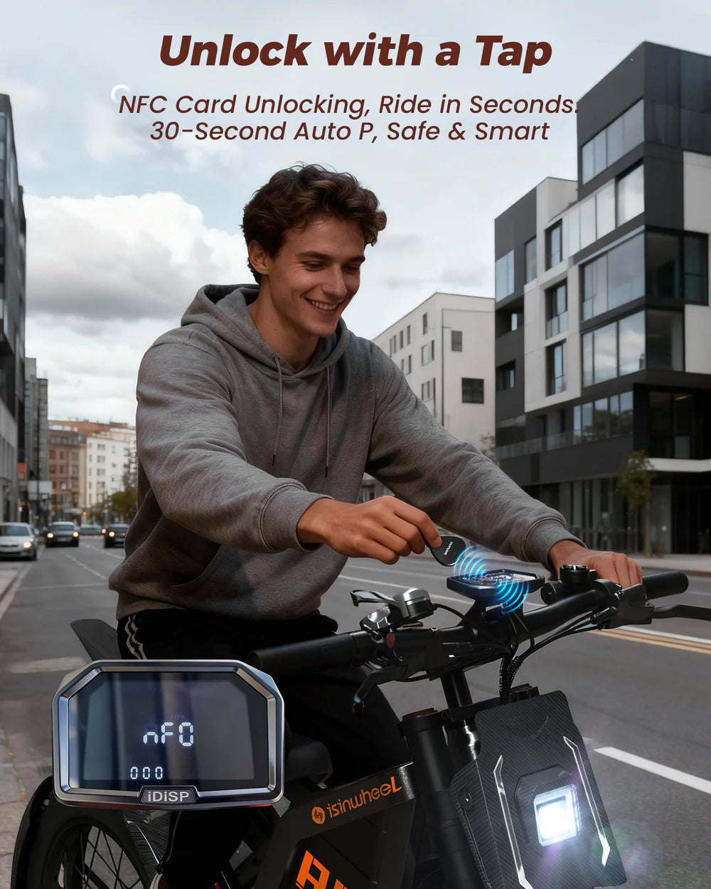 Powered by a 3000W peak motor, the Isinwheel R8 delivers strong torque and rapid acceleration, reaching speeds of up to 35 MPH. Its high-capacity 48V 27Ah removable battery provides an impressive up to 150 miles of assisted range, making it one of the longest-range electric dirt bikes in its class. The removable battery design allows for convenient charging at home or in the garage.