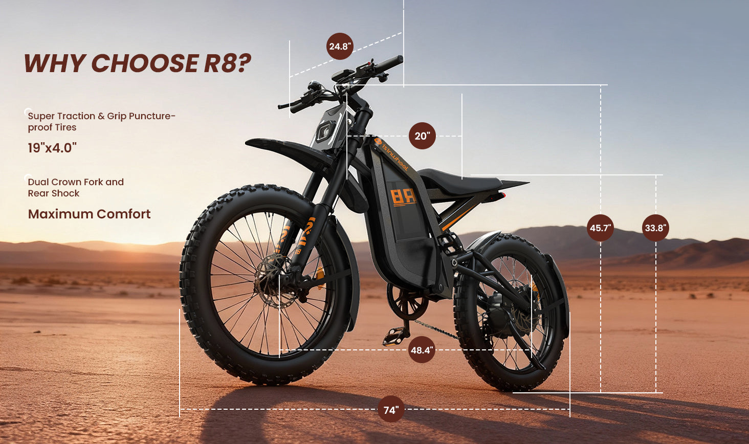 Designed to handle dirt roads, gravel paths, and uneven trails, the R8 features full suspension and 19×3.0 off-road motorcycle tires for stability and comfort on rough terrain. Hydraulic disc brakes ensure confident stopping power, even at higher speeds or in demanding conditions. Integrated front and rear lights improve visibility for safer riding.