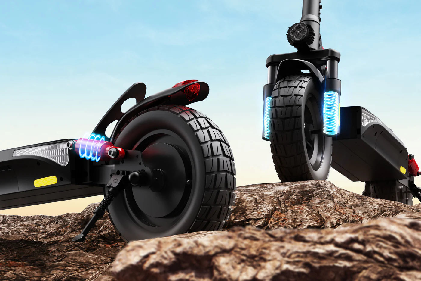 The iX3 model is equipped with 10-inch pneumatic all-terrain tires, offering good shock absorption for city streets, light trails, and uneven surfaces. While not designed for heavy off-road use, it performs well on most urban terrain.