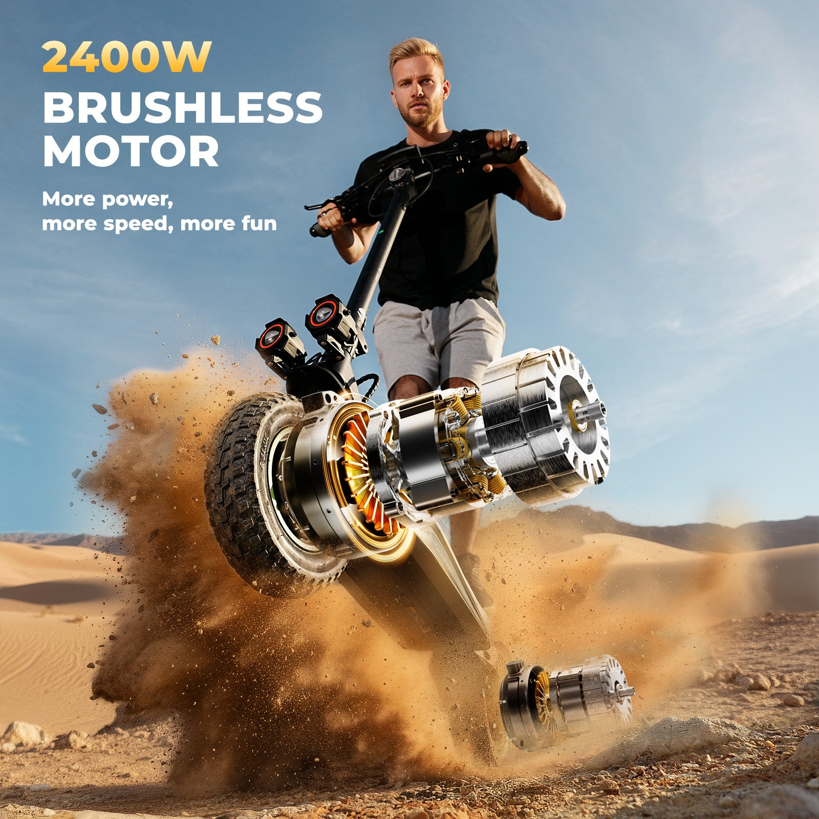 Powered by dual 1,200 W motors (2,400 W total) and a 52 V 18.2 Ah lithium battery, the GT4 reaches speeds of up to 45 mph and offers a maximum range of 50 miles per charge. Its 12-inch off-road pneumatic tires provide superior traction, while dual hydraulic suspension ensures a smooth and stable ride across any surface.