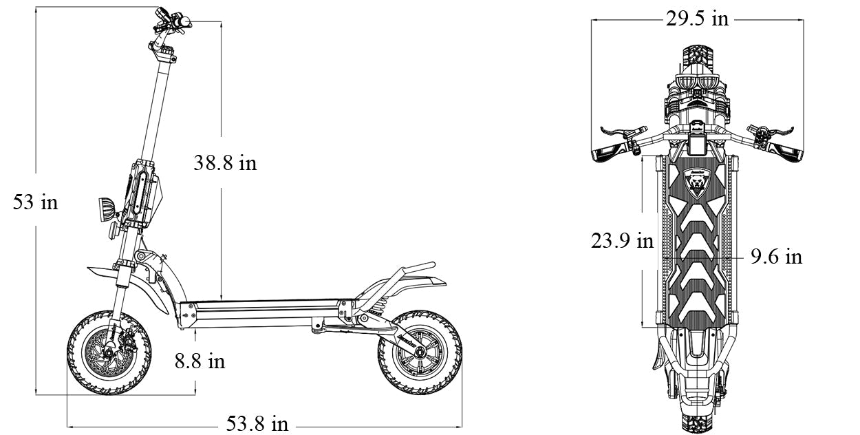 Powered by dual 2000 W motors (13,440 W peak) and a 72 V 40 Ah lithium battery, the King GTR Max reaches a top speed of up to 65 mph and offers an extraordinary range of up to 124 miles per charge. Its motorcycle-grade hydraulic suspension, 100/55-7 off-road tires, and hydraulic disc brakes with EABS ensure smooth handling and confident stopping power on any surface.
